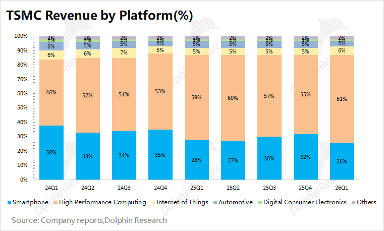 手机业务出现“季节性回落”的表现。本季度手机业务收入93.3亿美元,环比下滑13%。手机和HPC两项业务合计占比达到87%,是台积电最主要下游应用领域。