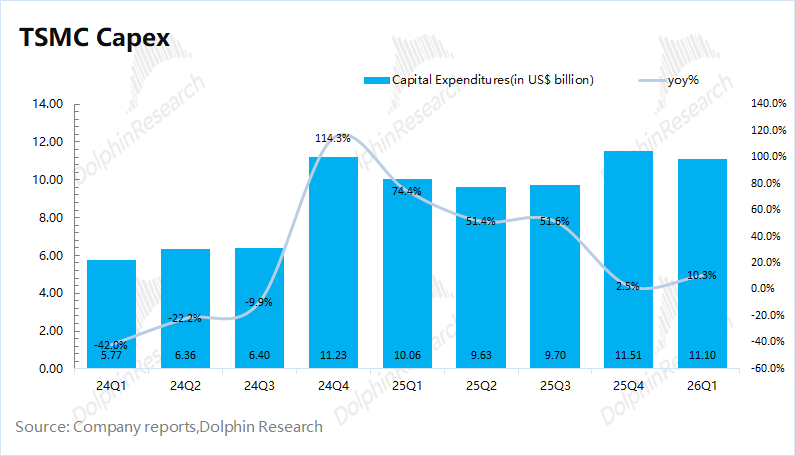 4、资本开支:台积电本季度资本开支111亿美元,由于公司指引2026年全年资本开支上调至520-560亿美元的区间较高水位,那么后面三个季度的资本开支有望达到440亿美元左右,可见公司的资本开支主要集中在下半年。