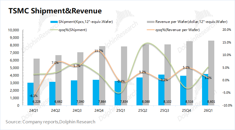 从量价关系看(等效12寸片):①台积电的晶圆出货量4174千片,环比增长5.4%;②台积电的晶圆单晶圆收入(等效12寸片)8601美元/片,环比增长1%。