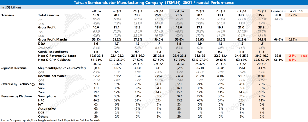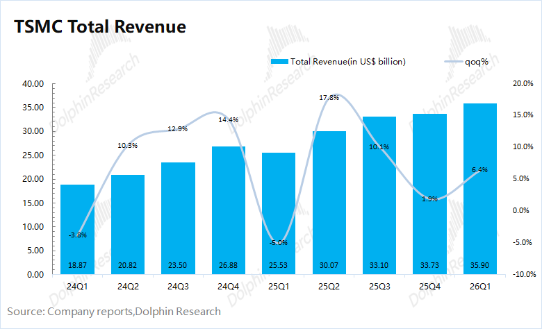 台积电在2026年第一季度实现营收359亿美元,好于此前指引区间(346-358亿美元)。本季度收入环比增长6.4%,主要受AI芯片需求增长的推动,当前逐步从5nm转移至3nm平台。
