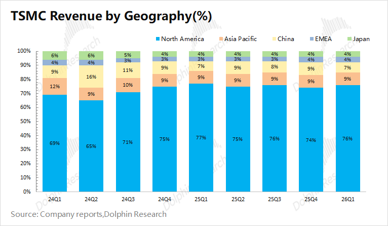 从各地区收入来看,北美地区仍是台积电最大的收入来源,收入占比为76%。这是由于北美地区有苹果、英伟达、AMD、高通等大客户,使得台积电和美国之间有很强的商业绑定关系。