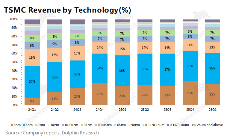本季度7nm以下的收入占比维持在74%,先进制程领域是公司的核心收入来源。具体来看,本季度公司3nm收入占比为25%,5nm的收入占比维持在36%。
