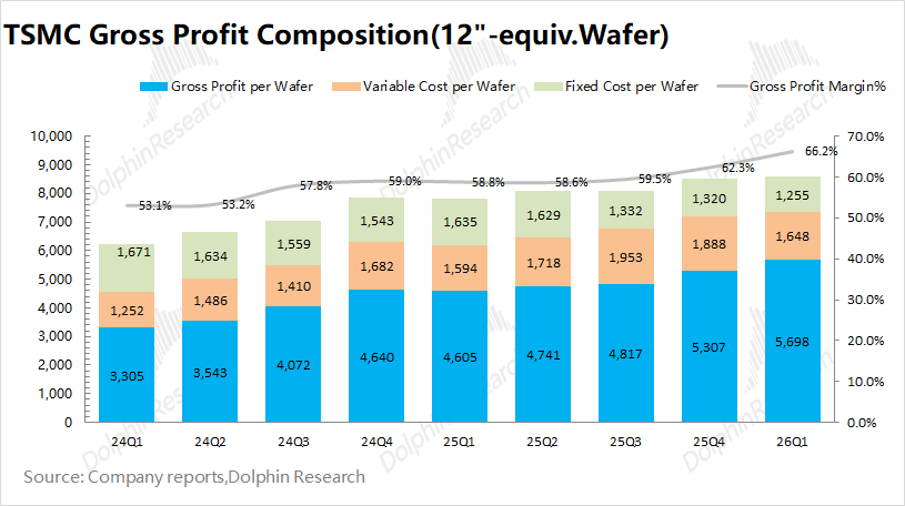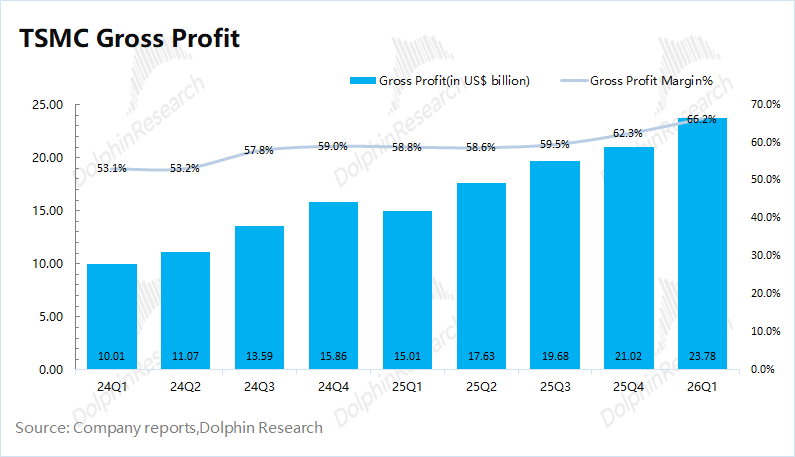 台积电在2026年第一季度实现毛利238亿美元,环比增长13%。其中毛利率66.2%,环比提升3.9pct,接近上调后市场预期(66-66.5%),受均价提升和单位成本下降的双重影响。