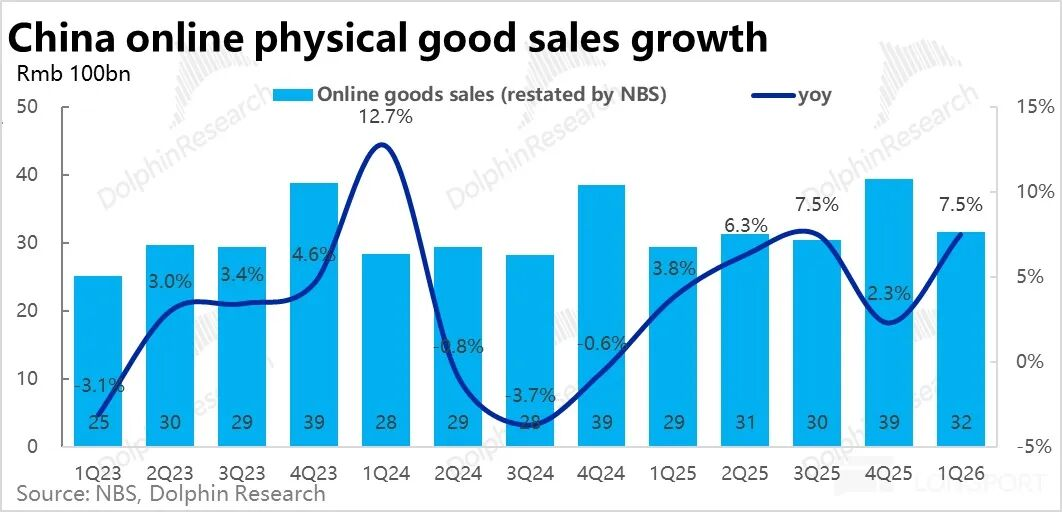 对于线上消费,进入26年后统计局对线上零售的总口径做了一定变更,由此前的“网上零售额”变更为“网上商品&服务零售额”,大幅扩大了对网上服务型零售的统计范围。不过,对网上实物商品零售的统计口径不变,依旧和历史数据可比。