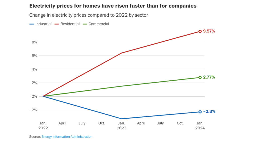 据《华盛顿邮报》报道,电力成本上涨对各类用户的影响并不相同。