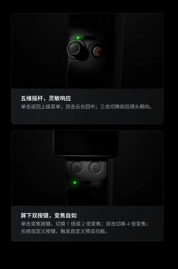 最直观的两点变化:旋转屏幕后下方多了两枚物理按键——一颗变焦摇杆、一颗自定义C键,意味着横屏拍摄时可以更多脱离触控操作,单手就能搞定变焦和预设切换。这个改动在「一手抓相机、一手拎东西」的vlog场景里,比想象中要实用。