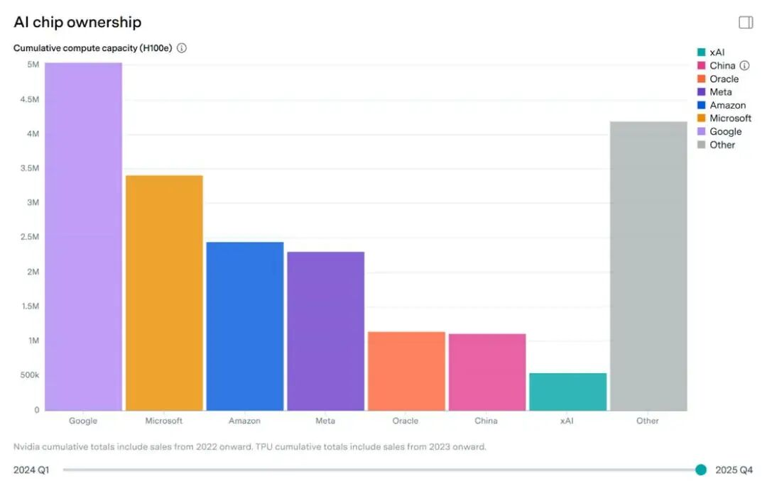 一方面,尽管中国电力资源在存量与增量上都远超美国,但中国在算力硬件的供给上仍然逊于美国。按照EpochAI最新统计,如果按H100当量计算,中国的算力规模仅相当于甲骨文一家公司的水平,远不及谷歌、微软、亚马逊与Meta。