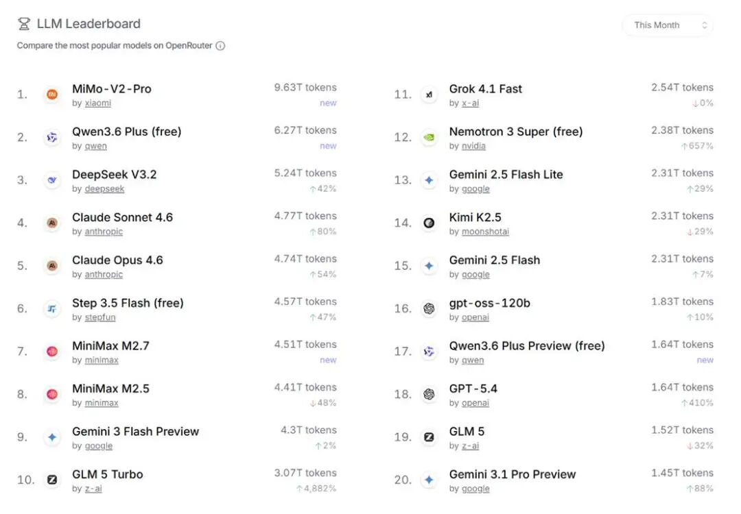不过,情况正在发生变化。近期,OpenRouter上排名前二的模型,来自小米的MiMo-V2-Pro,与阿里巴巴的Qwen3.6 Plus(free),均未开源。以前者为例,其唯一的服务提供方即为小米本身,应该算“token出海”。