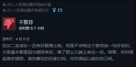 4月3日,游戏正式发售,当日好评率为93%,彼时还没有多少人通关这款游戏,大多数评价都来源于原作粉丝。可与“好评如潮”的商店页面相对照的,却是社交平台上,围绕女二号林翩翩“娼妓”设定展开的大量声讨。