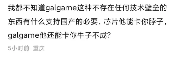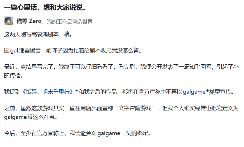 此番发言被视作切割Galgame,也被视为一种背叛:享受了玩家对于Galgame的宽容,热情,那么你的作品质量又是否能和正八经的文字冒险游戏掰掰手腕?