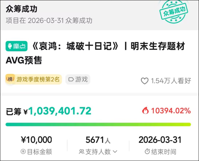 在哀鸿正式发售前,开发组零创游戏就在摩点组织了众筹预售。虽然此次众筹,从公开起风波不断,但是成绩却依旧喜人,为期不到2个月的时间,有超5千人参与众筹,众筹金额也顺利突破100万元。