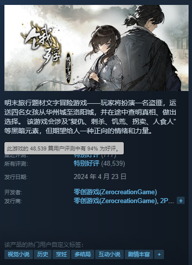 2024年,嵇零创作了《饿殍:明末千里行》(以下简称:饿殍)。作为一部历史题材文字冒险游戏,饿殍选择了一个充满话题性的时代作为背景;而随着游戏内“恪守男德”“萝莉洗澡”等等有趣的内容流出,饿殍逐渐破圈,销量突破百万,成为那一年最成功的游戏之一。无数粉丝被饿殍打动,也因此自然而然地把期待投向了它的正统续作哀鸿。