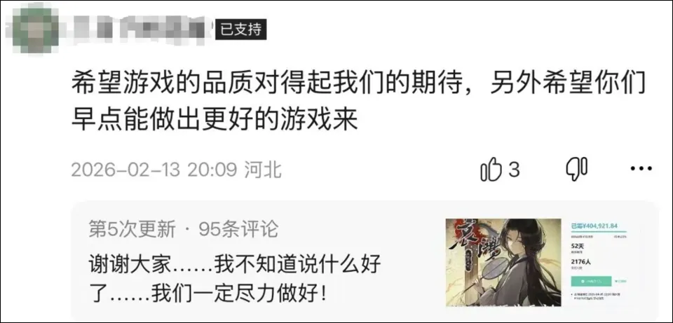 参与众筹,本质其实是在摸奖,猜测详情页面里写的是否对板,靠本性去尝试信任创作者在得到支持后,会创作出想要的故事。可一旦作品出现问题,参与众筹的玩家被背叛,原本就岌岌可危的信任彻底崩塌……一个名不见经传的小制作组到底谁会在意,只能谈国G还能多呼唤一点共鸣。