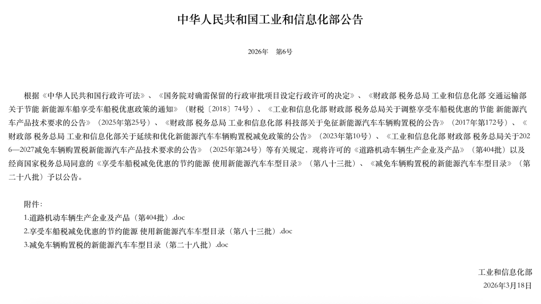 2月6日,第404批《道路机动车辆生产企业及产品公告》新产品拟发布内容公示。3月18日,工业和信息化部发布2026年第6号公告,正式公布第404批《道路机动车辆生产企业及产品公告》许可产品。