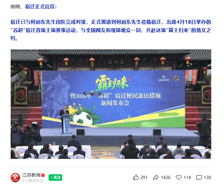 最近,宿迁文旅官宣了何润东将出席“苏超”宿迁首场主场赛事。