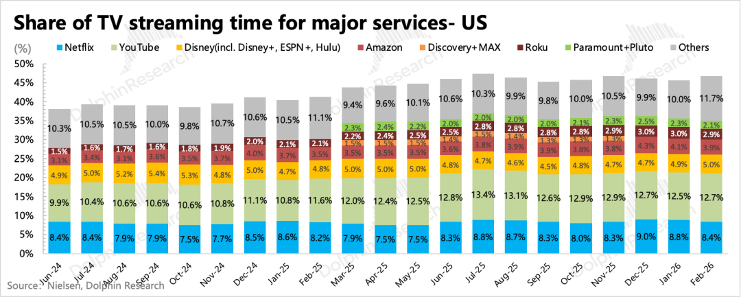 流媒体中,奈飞的份额相对稳定,12月因为《Stranger Things》第五季,收视率明显有反弹。同期YouTube保持平稳,Disney则有一些反弹,头部之外的其他平台继续上升,说明一些中小平台也有自己的垂类优势。