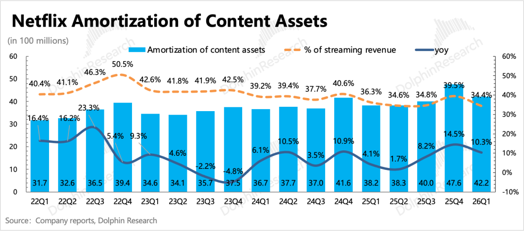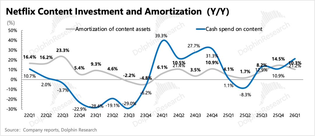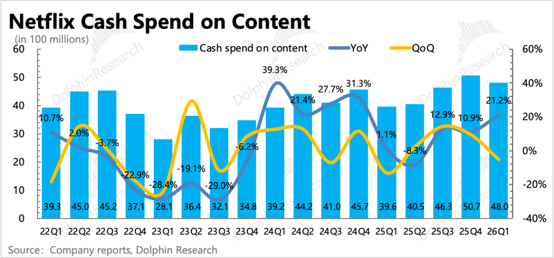 上季度电话会中,管理层透露了今年的内容投入预算:按照内容摊销成本增长10%,内容现金投入/内容摊销成本=1.1x的计划来算,预计全年内容投入规模接近200亿。原先海豚君认为,收购WBD带来的现金流压力,可能会促使奈飞实际做内容投入时会和去年一样有所控制。