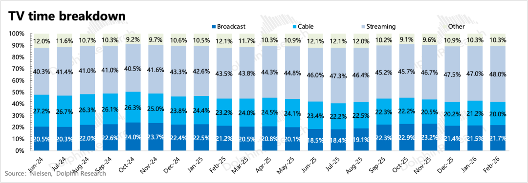 从北美Nielsen收视份额的数据来看,剪线趋势在走过“后疫情线下经济回归”导致的平台期后,近两年又有一些加速,截至2月流媒体收视份额提高到48%。