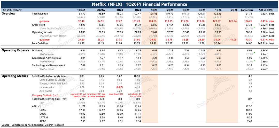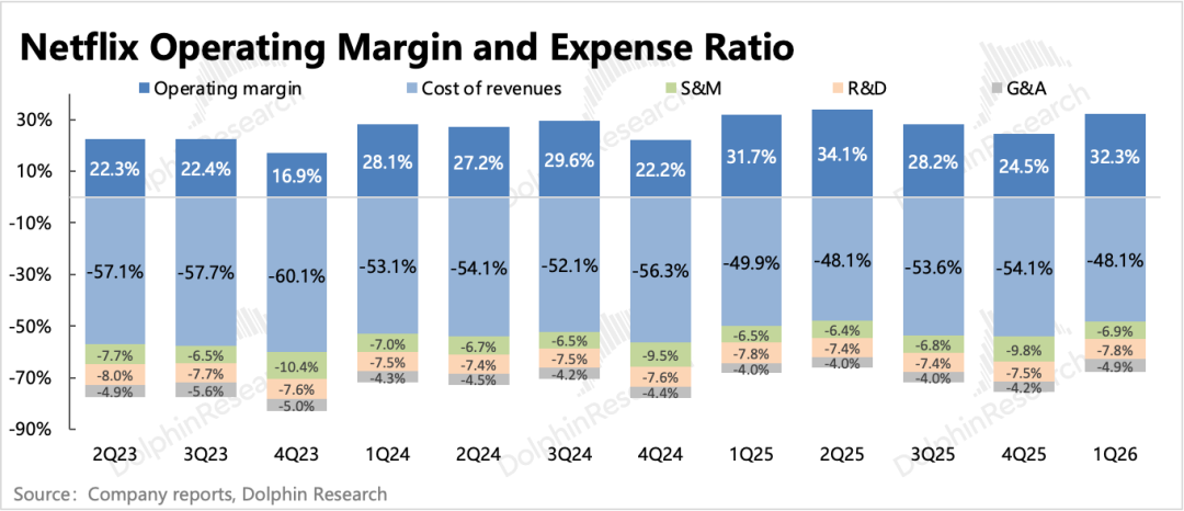 对今年全年的利润率水平,公司也没做调整,还是31.5%(同比+2pct)。但上季度管理层提及,收购WBD对全年的利润率影响0.5pct,因此机构在奈飞放弃收购WBD后,已经对利润率的预期提高到了32%左右。