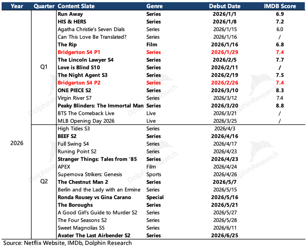 上季度海豚君就已经提及奈飞的最强内容周期已经进入尾声,Q1还有《Bridgerton》第四季和去年末较晚上线的《Stranger Things》第五季撑着,但二季度的排片上就相对较弱了。