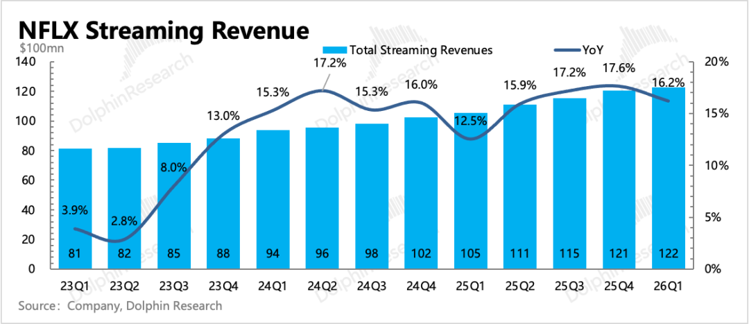 一季度总收入122亿,同比增长16%,汇率不变下内生增速为14%,小幅超出原先指引和预期。通过粗略拆分量价变化关系,海豚君猜测主要超预期在用户订阅规模和广告收入。一季度仍属于这一轮内容周期的尾声,用户时长、参与度均不低。