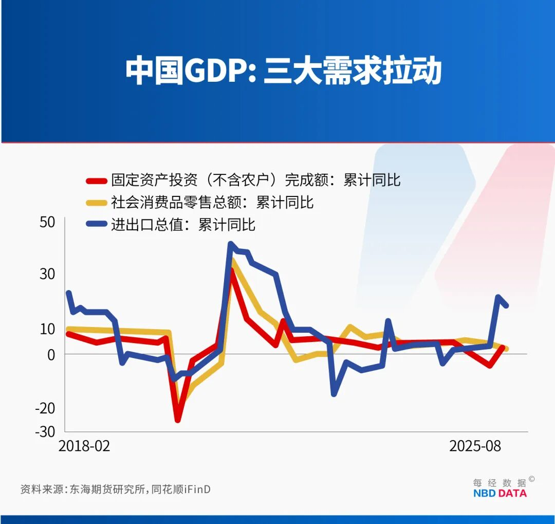 出口方面表现突出。一方面源于我们产业链的韧性和竞争力,特别是“新三样”(锂电池、新能源汽车、光伏产品)的出口优势;另一方面,很多民营企业在国内面临“内卷”,纷纷到海外谋求发展,民营企业出海后,其所需的原材料、零部件、中间件仍要从国内采购,形成了出口拉动效应。因此,进出口都在增长。各项指标环环相扣、相互关联。