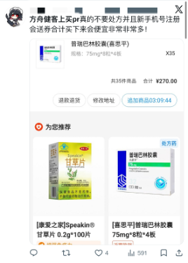 这是我们在X上看到的一条帖子,附图是帖主在方舟健客上一次性成功购买35盒普瑞巴林的订单截图。