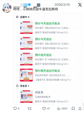 “我给朋友网购普瑞巴林,用豆包生成处方忘记消除水印了,但最后还是购买成功了。”这是一位OD者在X上发的帖子。我们追踪该发帖人的第三天,他发布了在淘宝5家药房购买大量普瑞巴林的订单截图。仅隔两日,她又更新实拍配图,展示所有的药品均已到货。
