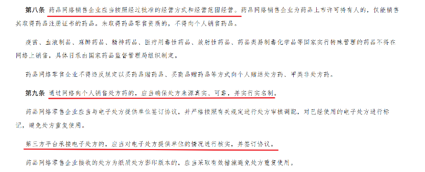 按照《药品网络销售监督管理办法》规定,第三方平台应当建立处方审核、实名购买等制度,核实电子处方提供单位资质,并对违规行为立即停止服务并报告监管部门。按照规定,平台理应承担起药物合规销售的“守门人”的职责。