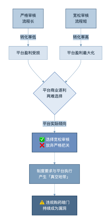 在我们的实际操作中,审核处方环节却被一张PS假处方轻易突破。这种选择环节的审核性弱化,背后是清晰的商业考量:严管医生不影响交易,严管处方却会拉低转化率。