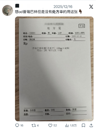 小野患有严重焦虑和抑郁,为了让自己镇静下来,他逐渐对普瑞巴林产生了依赖。闲暇时,他也会主动浏览X上“OD红人”的分享帖,“这些人精神状态太差了,对自己的身体不负责、也无所谓,竟然会冒着生命危险主动去尝试各种药。”