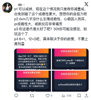 被问及如果未来政策继续收紧,云南的管控政策推广至全国,普瑞巴林再也不能从线上购买时,他会怎么做。小野回答:“我会在X上面跟着大部队的脚步走,尝试新的药来代替它。”
