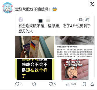在X的公开广场,关于OD的讨论也极其泛滥。有的人会探讨右美沙芬、美金刚、思诺思等药物的“娱乐价值”;也有的人会像写日记一般,用文字、图片记录自己的用药体验、购药经历;还有一群“OD红人”,他们的私人生活,铤而走险的滥用经历等各种猎奇轶事也在圈内大肆传播......这些被拿来娱乐消遣的讨论,像无形中助长了滥用行为的扩散。
