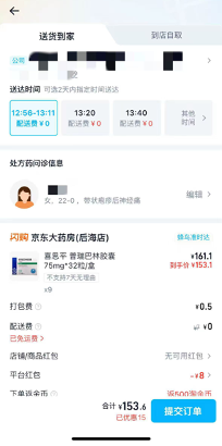 我们在淘宝闪购随机选择了一家深圳的线上药房,搜索普瑞巴林后,系统引导填写基本信息,弹出一个症状选择框,我们勾选了“带状疱疹后神经痛”这一预设症状,随即便进入了药物选购阶段。付款成功后,显示“订单已提交,等待医生开方”,十分钟后,平台显示已安排骑手配送。于是,就在没有就诊经历和病例处方的条件下,我们顺利买到了9盒、共计288粒的普瑞巴林。