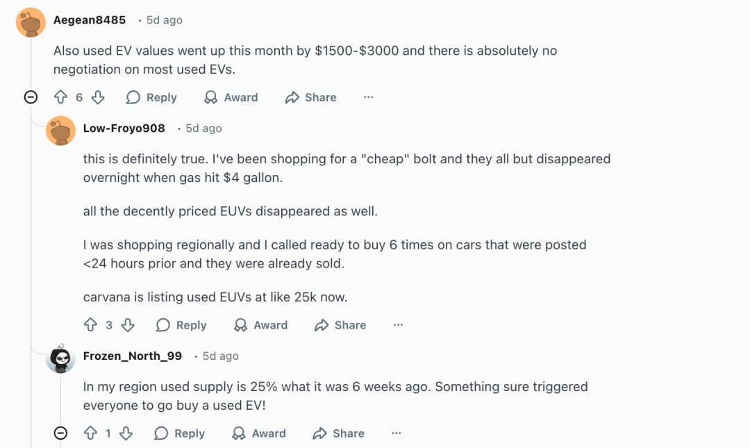 不仅如此,一些二手电车也开始供不应求。来自全球各地的Reddit网友表示,“这个月我们看的时候,所有比较新的二手电车在我们打电话过去之前都卖掉了”、“我当时在附近区域找车,有6次打电话准备购买,但都是在发布不到24小时前才挂牌的,结果都卖掉了”、“我所在地区的二手供应量只有六周前的25%”。