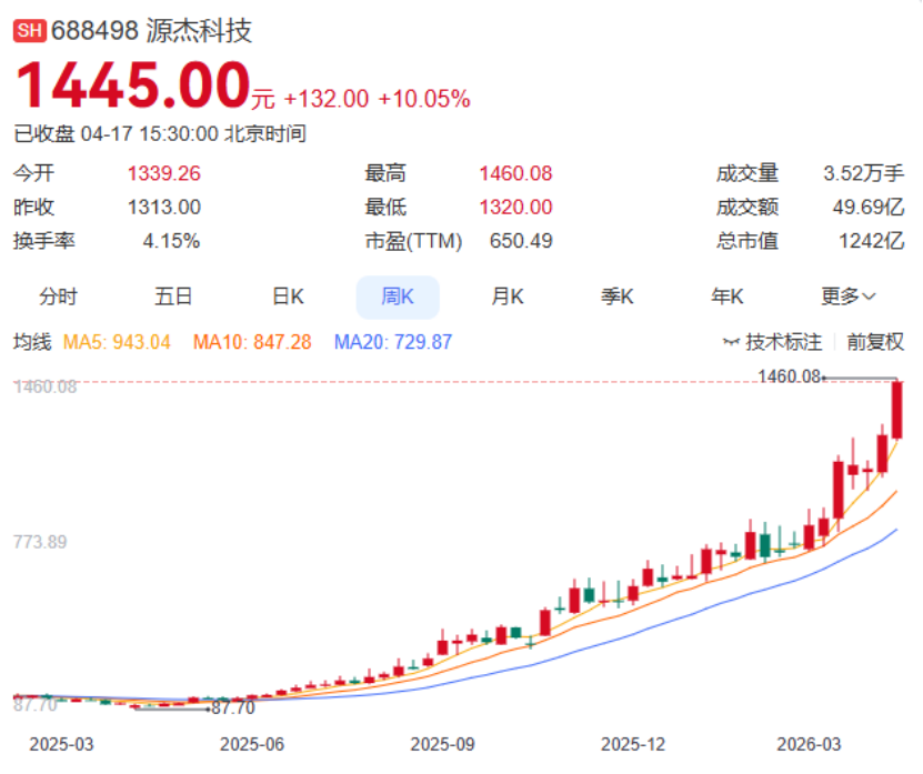 从2025年4月9日的盘中低点88.1元,到2026年4月17日收盘高点1445元——源杰科技用一年时间走完了约1500%的涨幅。截至收盘,总市值约1242亿元,PE(TTM)达到650倍。