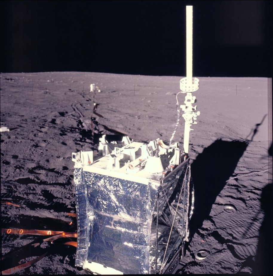 ▲图源:NASA|这张照片是在1969年11月19日,阿波罗12号任务中拍摄的「测量员3号」着陆器,中央银色立方体结构是「测量员3号」的主体,左下角可见橙红色带状物——那是阿波罗12号登月舱下降级的着陆腿支架和电缆束。