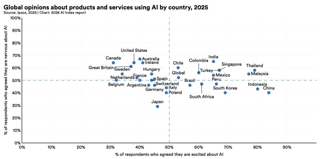 北美与欧洲国家对人工智能的总体看法仍集中在“低兴奋度”和“高紧张感”的区间。相比之下,中国和印度尼西亚公众对AI看法则总体乐观。图源:The 2026 AI Index Report|Stanford HAI