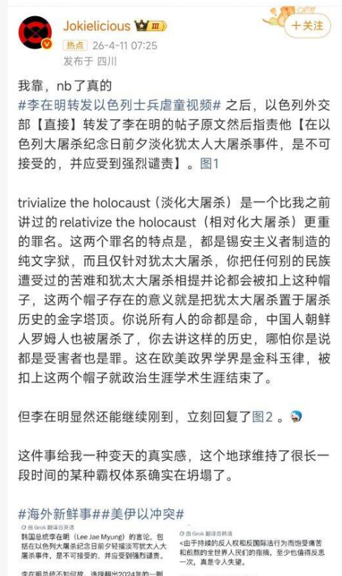 韩国总统李在明在社交平台转发以色列暴行,韩国政府也宣布向伊朗提供人道主义援助