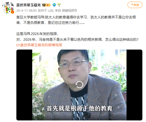 当然,这个世界毕竟是唯物的。住在特拉维夫的张平,至少有一套没被伊朗导弹炸掉的房子,才能为内塔尼亚胡歌功颂德;复旦大学退休教授冯玮,享受着优厚的退休金,才能在2026年说出“犹太人的教育不是仇恨教育,值得你去学习”这种荒唐话。