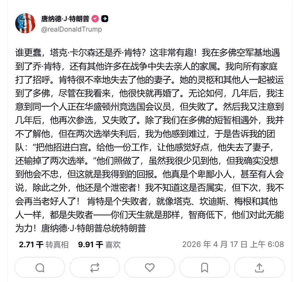 真正忠于特朗普的MAGA老臣,塔克·卡尔森为了特朗普可以公然造谣2020大选拜登作弊,结果被起诉丢了工作;坎迪斯·欧文斯身为黑人可以为了特朗普批评民主党“奴役黑人”,否认美国有系统性歧视黑人;亚历克斯·琼斯可以为了特朗普造谣说“枪击案是反对拥枪权的坏蛋制造的”。这些人在特朗普被民主党送上法庭的时候都不离不弃,现在特朗普又成了总统,他们却因为反对过度亲以而和特朗普反目成仇。