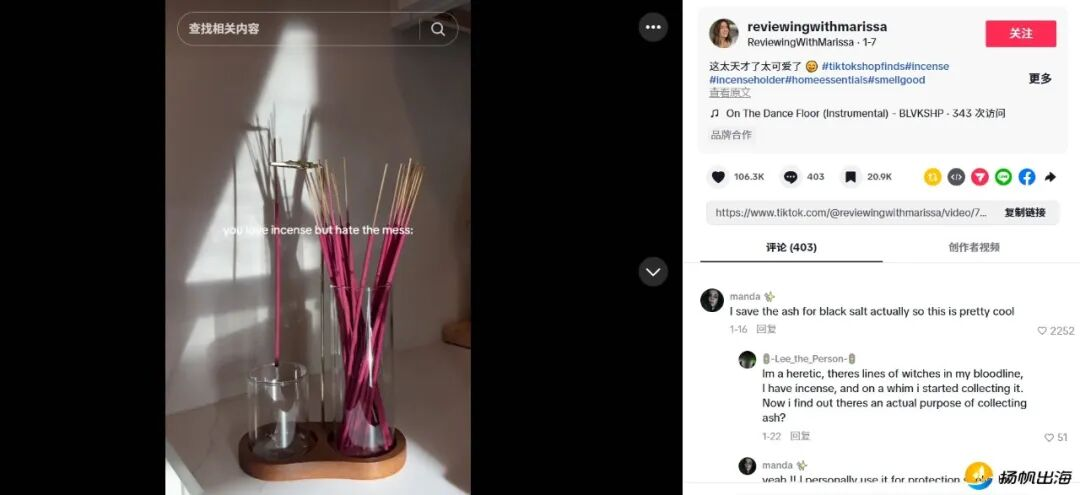 同款香插在TikTok上的内容营销。图源:TikTok