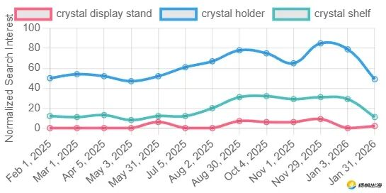 水晶的走红,还带动了上下游配件市场的爆发。谷歌搜索数据显示,“水晶支架(crystal holder)”和“水晶陈列架(crystal shelf)”从2025年2月至2026年1月搜索量总体呈上升趋势。消费者愿意为这些“器具”买单,本质上是为了构建一个完整的“能量场”或“美学空间”,让水晶的“疗愈价值”与“装饰价值”完美融合。