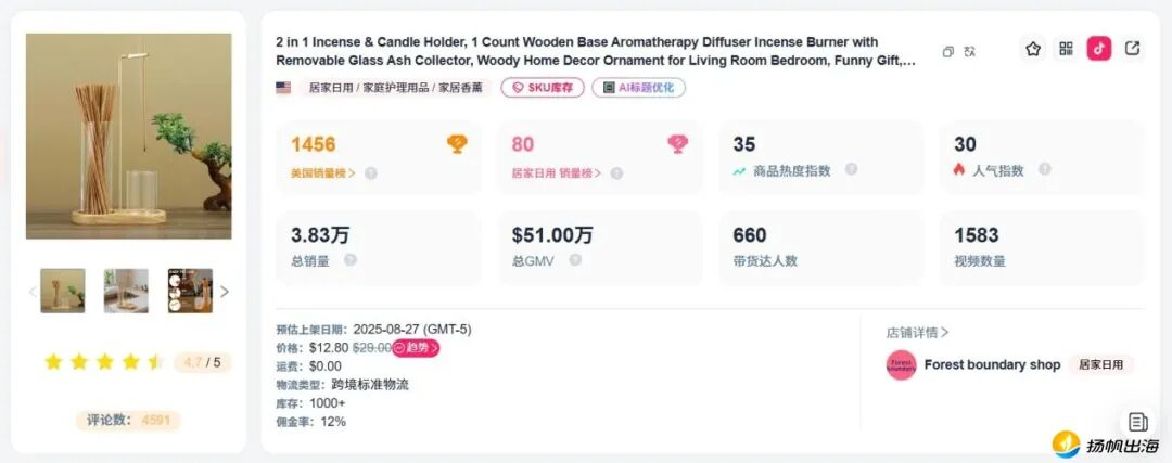 事实上,线香、香棒这样的小众香薰商品在海外一直有市场,带动着香插、香炉等香薰配件的销量增长。根据FastMoss数据,一家主打美区居家日用的TikTok店铺Forest boundary shop,于2025年8月上架了同款中式风格倒置香插,截至2026年4月17日,其总销量达3.83万件,GMV达51万美元,按央行中间价计算,约等于348.8万人民币,逼近350万元大关。