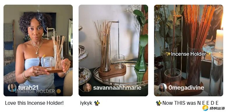 与水晶不同,线香无法独立使用,必须搭配香插、香炉等器具,这也让燃香器具成为“刚需配套”,带动相关品类同步增长。而开头提到的中式风格倒置香插,之所以能成为爆款,核心在于精准解决了传统香插的痛点,同时融入了中式美学设计,再借助TikTok内容营销,快速触达目标消费者。