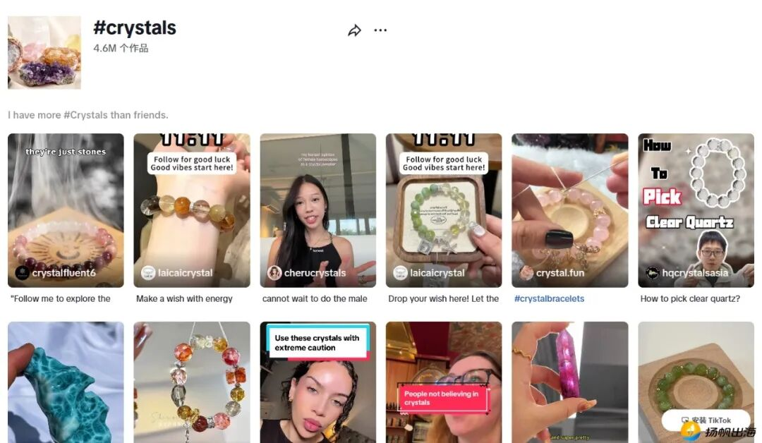 这一增长态势在社交媒体上表现得尤为直观。在TikTok平台,截至2026年4月17日,#crystals话题相关视频已达460万个,播放量突破百亿;Instagram上#crystals标签累计发帖也超过千万条,形成了庞大的内容生态。从内容趋势来看,水晶的产品形态也在不断演化:从最初的单颗水晶石、简约手链,逐渐延伸到水晶摆件、水晶塔、水晶球、水晶生命树等多元化产品,甚至出现了定制化款式,满足不同场景的消费需求。