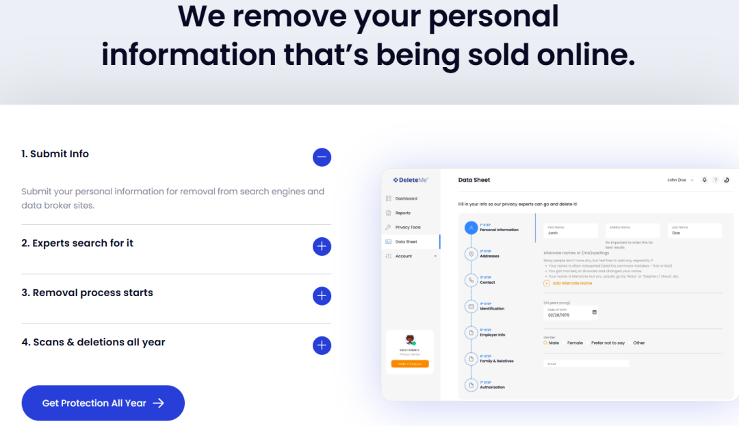 「DeleteMe」提供在线个人隐私数据的删除服务,用户提交个人信息后,「DeleteMe」的专家团队会从搜索引擎和数据网站中查找并删除这些信息;同时,支持定期排查服务,持续保护用户隐私。