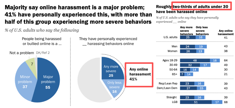 Chou的遭遇并非个例。据Pew Research的数据显示,41%的美国成年人都经历过网络骚扰,而近1/4遭遇过威胁、跟踪或持续性骚扰。这一比例在30岁以下的年轻群体中更为突出,接近2/3。