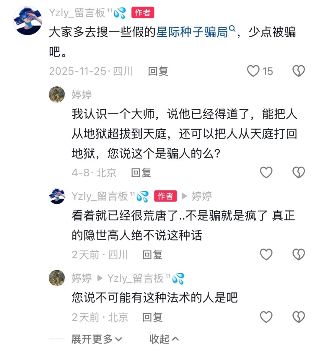 以及这样的:“我来地球20000多年啦,欢迎新来的星际种子觉醒”“我是来自天狼星的星际种子”。
