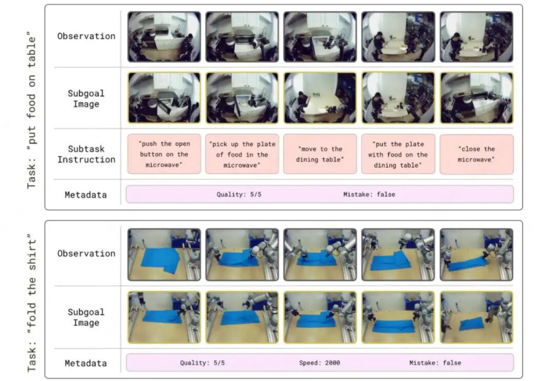 但在π0.7中,Prompt的角色明显发生了变化,它开始承担任务描述+执行约束+中间指导的功能,并不是就说一句话的形式,反而更加多样、详细: